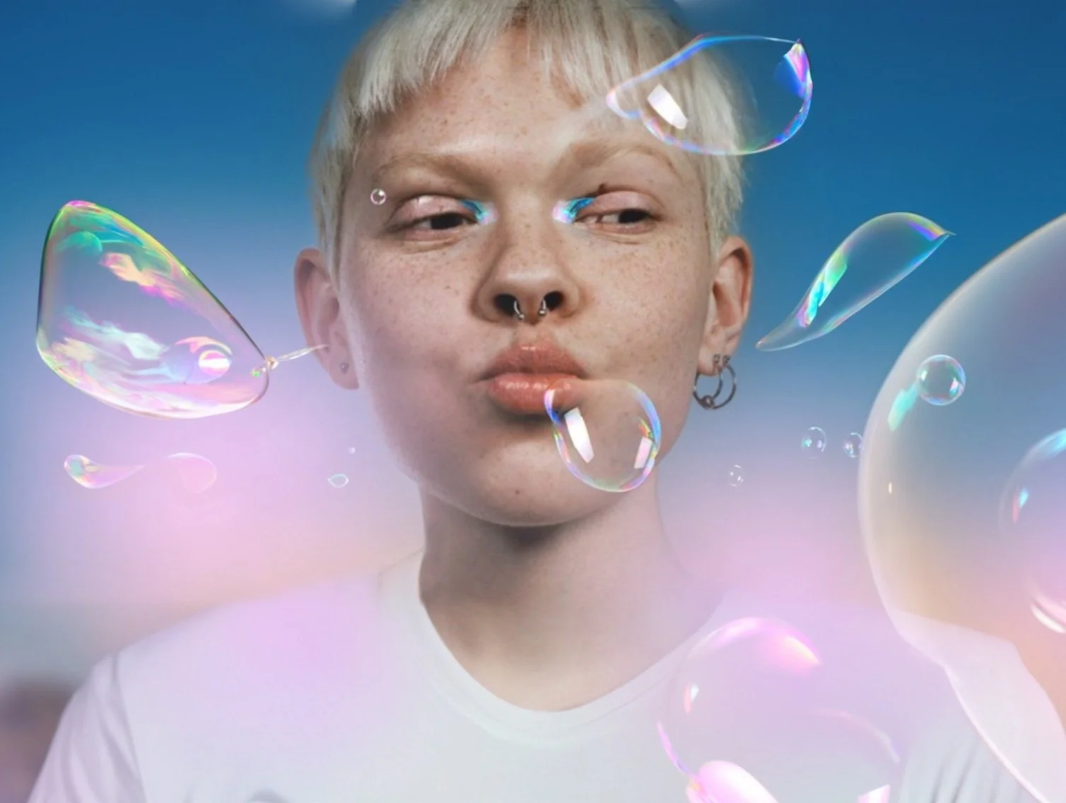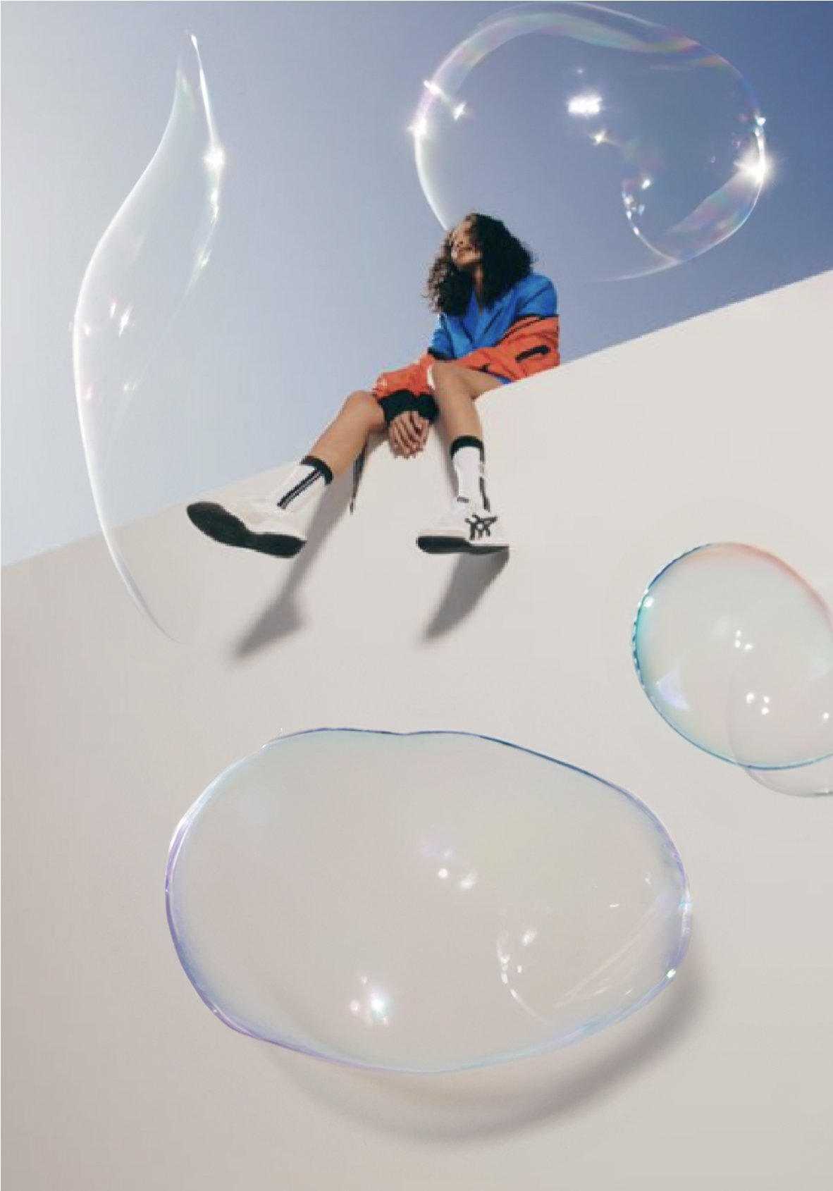 Visual Study: A series of compositional experiments combining found imagery (Pinterest/Google) with AI-generated soap bubbles. The aim was to capture movement and visual lightness through oversized bubbles and dynamic figures. For non-commercial, inspirational use only.